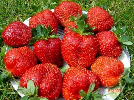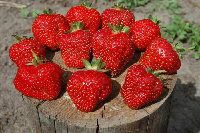 Сорт позднего срока созревания. Отличается крепкими кустиками, имеющим мощную корневую систему и толстые побеги. Ягоды очень крупные, весом до 120 г., имеют коническую форму, по цвету ярко-красные. На вкус мякоть ягод очень сладкая, чем-то напоминает землянику и имеет характерный аромат. Хорошо переносит заморозки. |